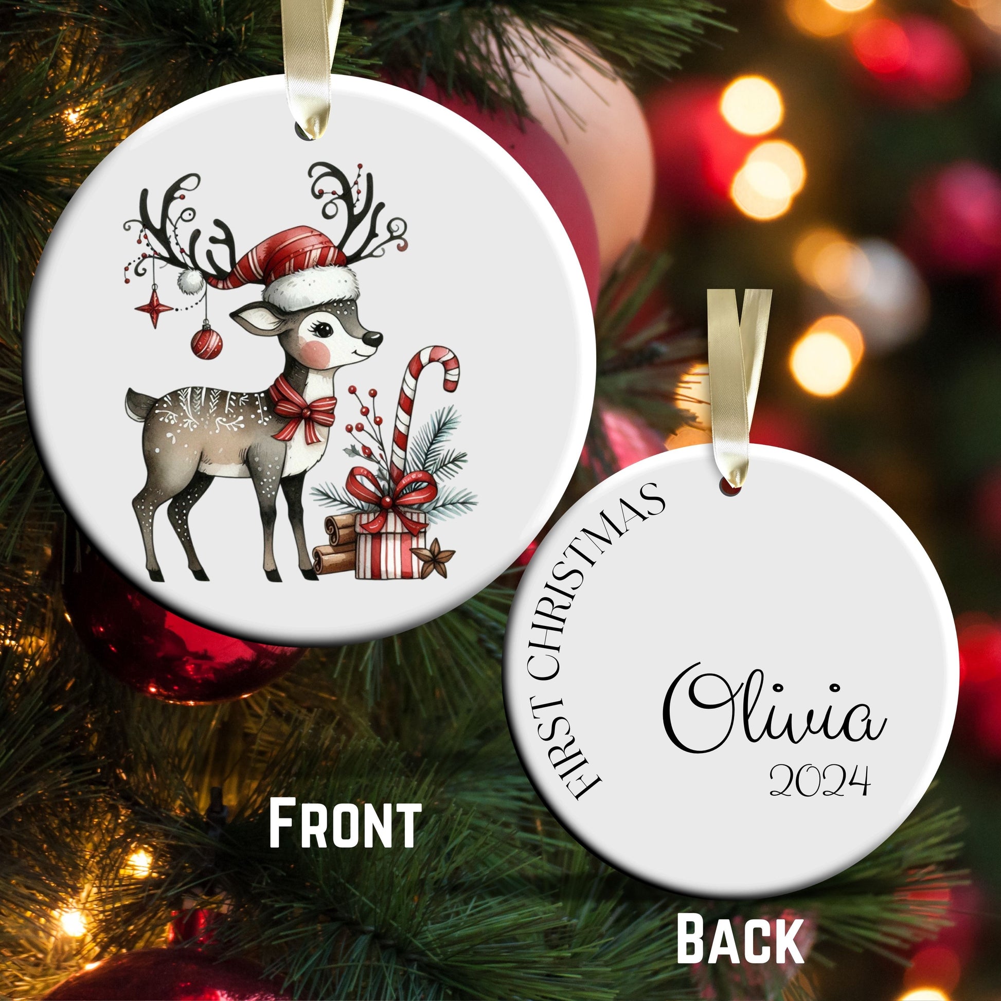 Customize our Baby's First Christmas Reindeer Ceramic Ornament with your childs name. Perfect for your that first gift of Christmas.