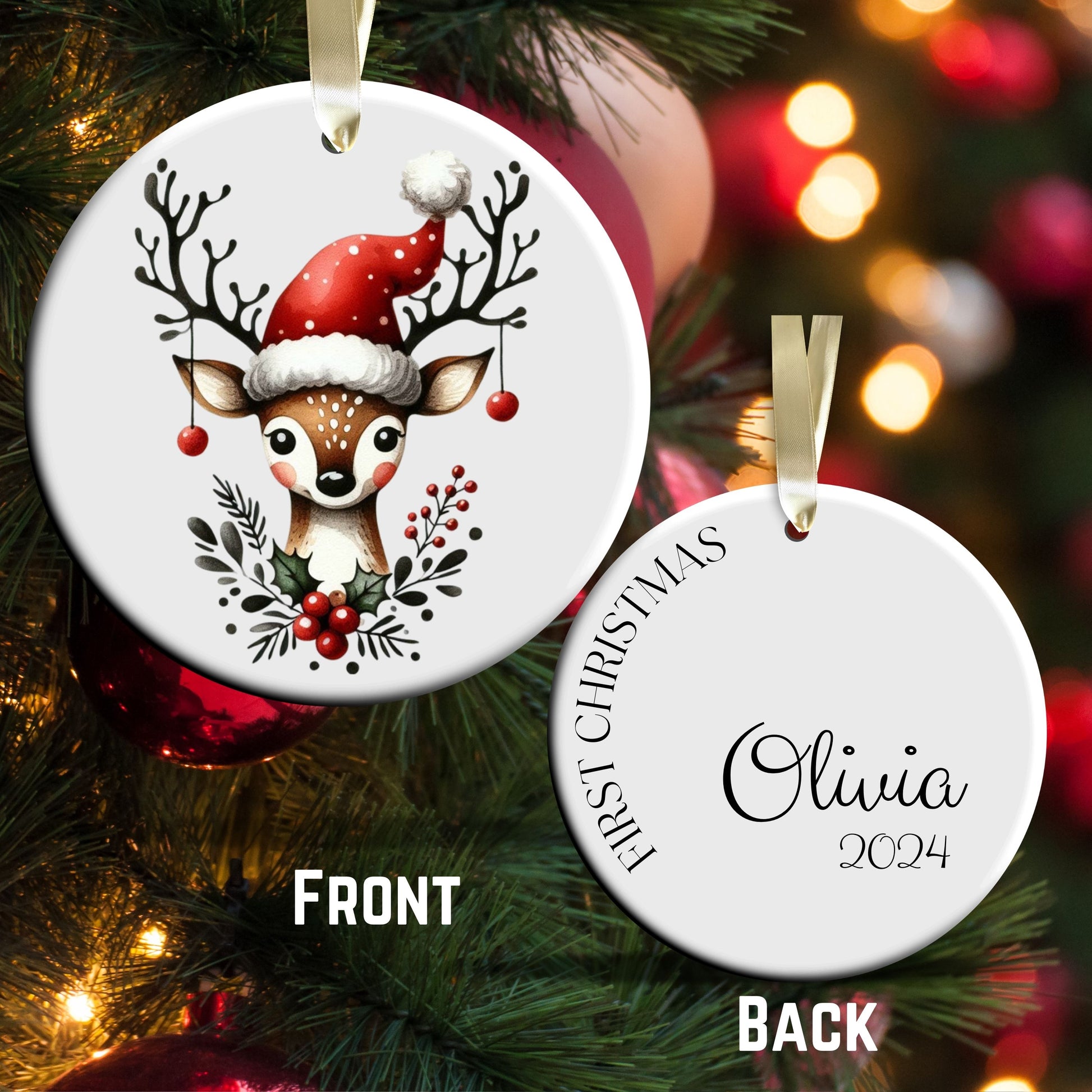 Customize our Baby's First Christmas Reindeer Ceramic Ornament with your childs name. Perfect for your that first gift of Christmas.