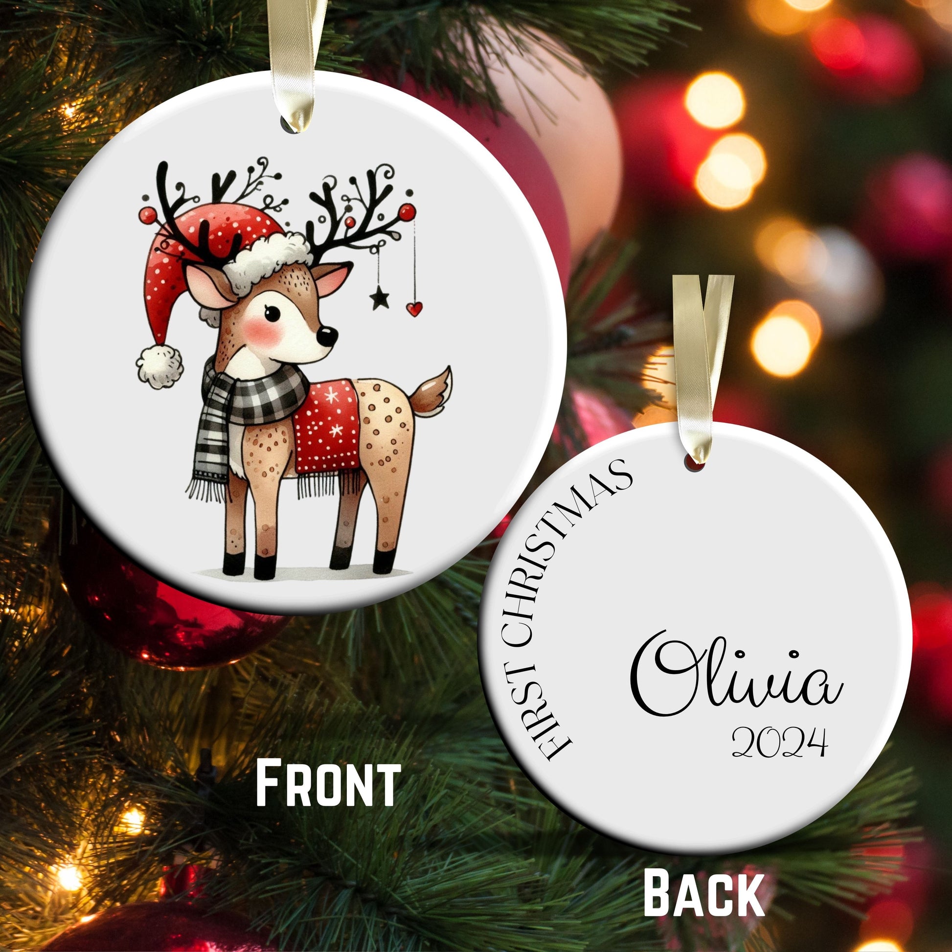 Customize our Baby's First Christmas Reindeer Ceramic Ornament with your childs name. Perfect for your that first gift of Christmas.
