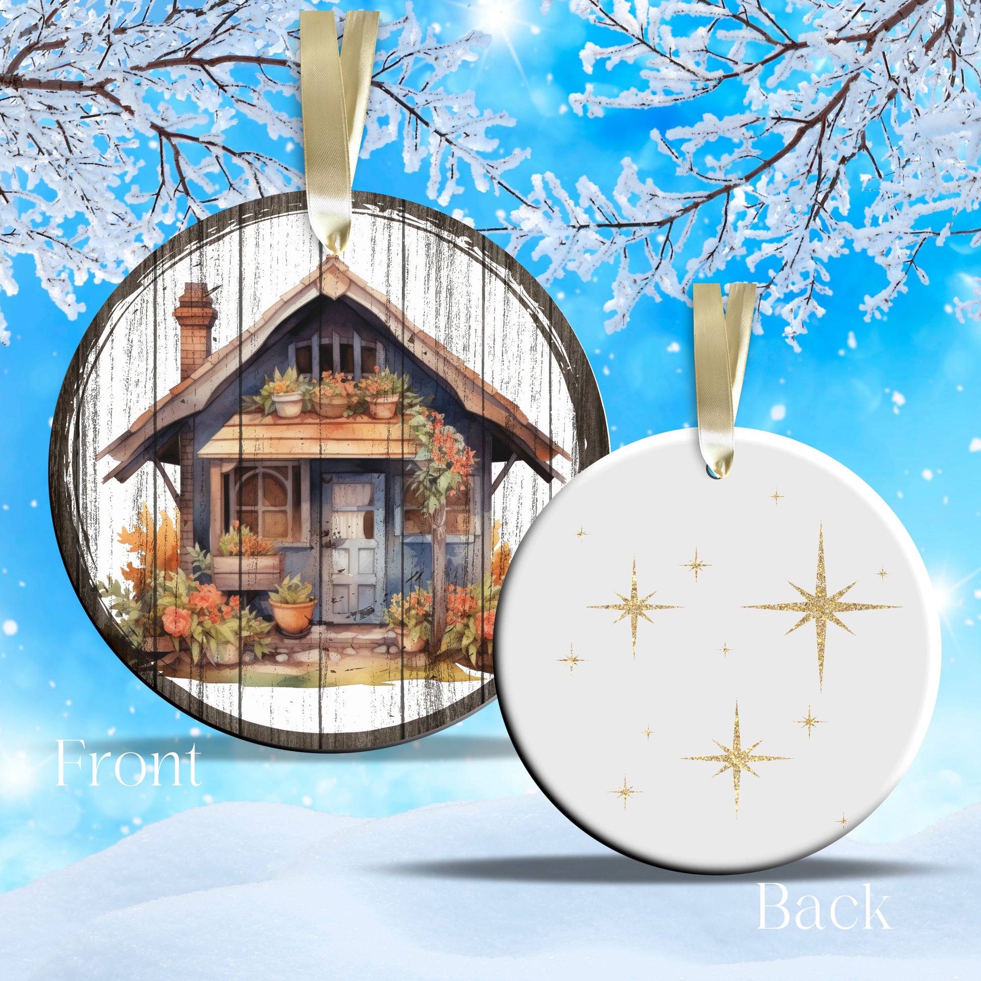 The image is printed on one side of the ornament and the back side has a finished background or what shows in the pictures.