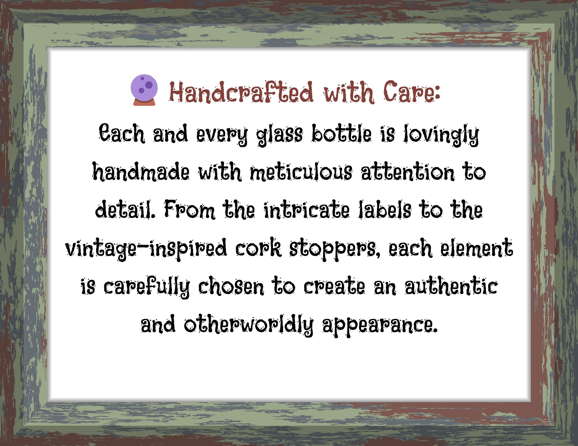 ๐ฎ Handcrafted with Care: Each and every glass bottle is lovingly handmade with meticulous attention to detail. From the intricate labels to the vintage-inspired cork stoppers, each element is carefully chosen to create an authentic and otherworldly appearance.