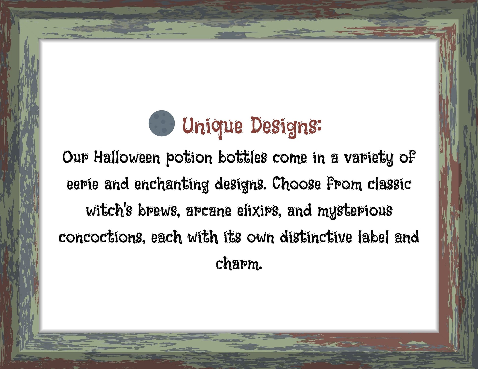๐ Unique Designs: Our Halloween potion bottles come in a variety of eerie and enchanting designs. Choose from classic witch's brews, arcane elixirs, and mysterious concoctions, each with its own distinctive label and charm.