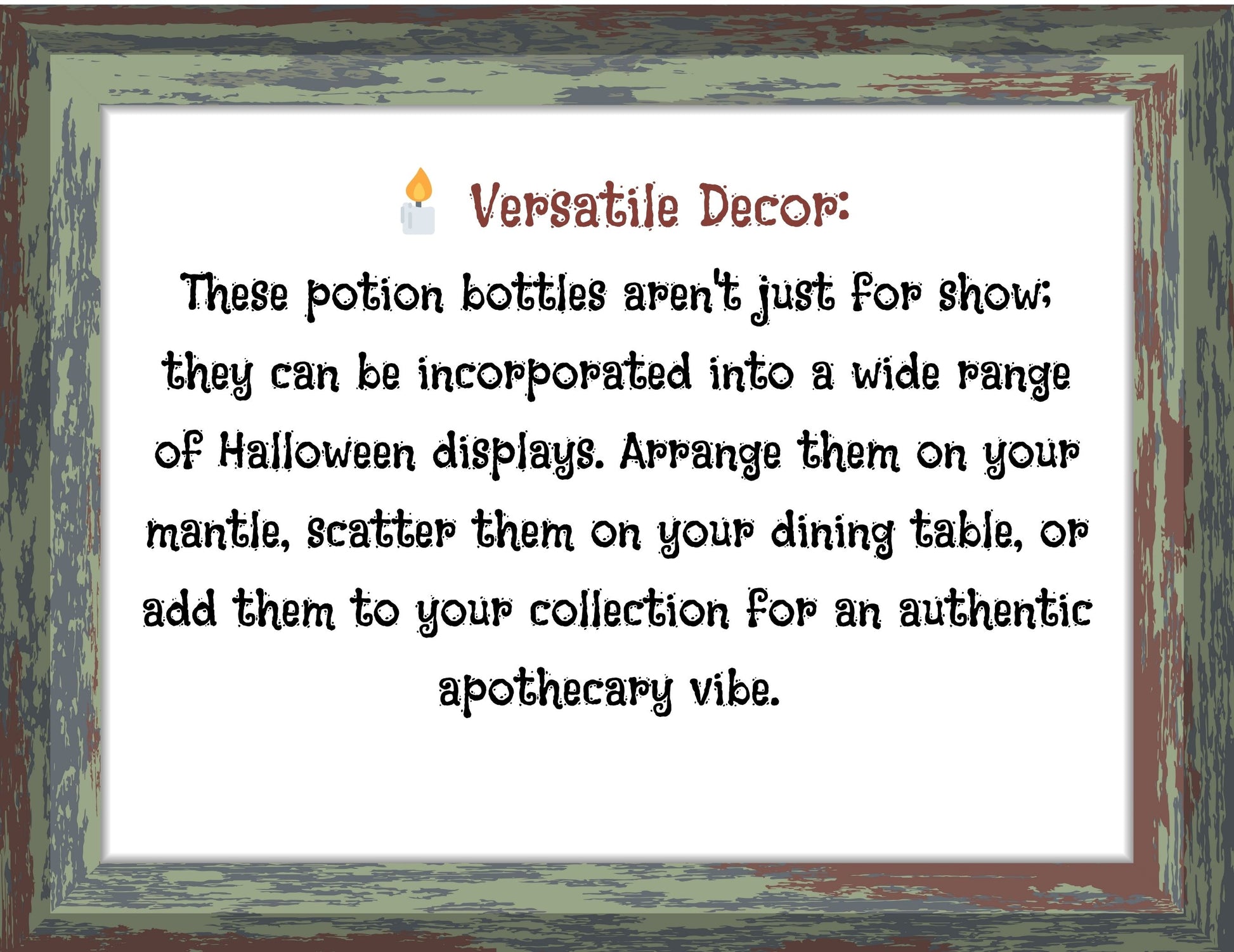 ๐ฏ๏ธ Versatile Decor: These potion bottles aren't just for show; they can be incorporated into a wide range of Halloween displays. Arrange them on your mantle, scatter them on your dining table, or add them to your collection for an authentic apothecary vibe.ย