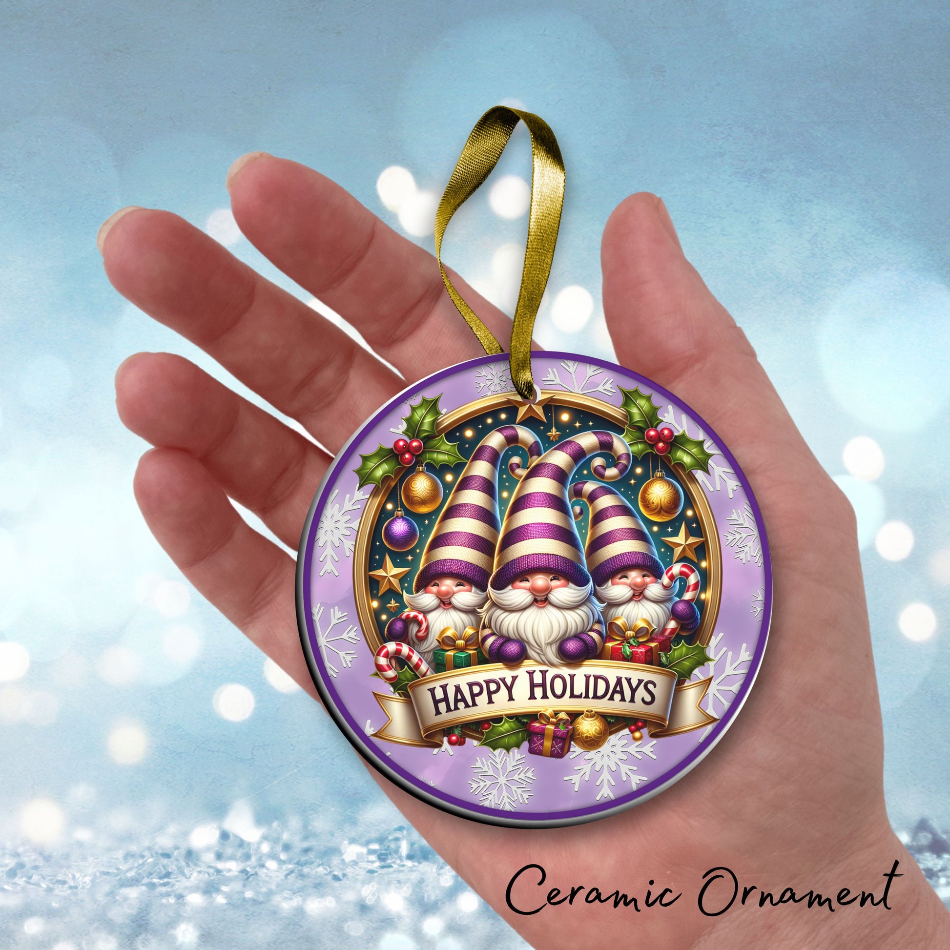 Happy Holidays Purple Gnome Ceramic Ornament 102-01