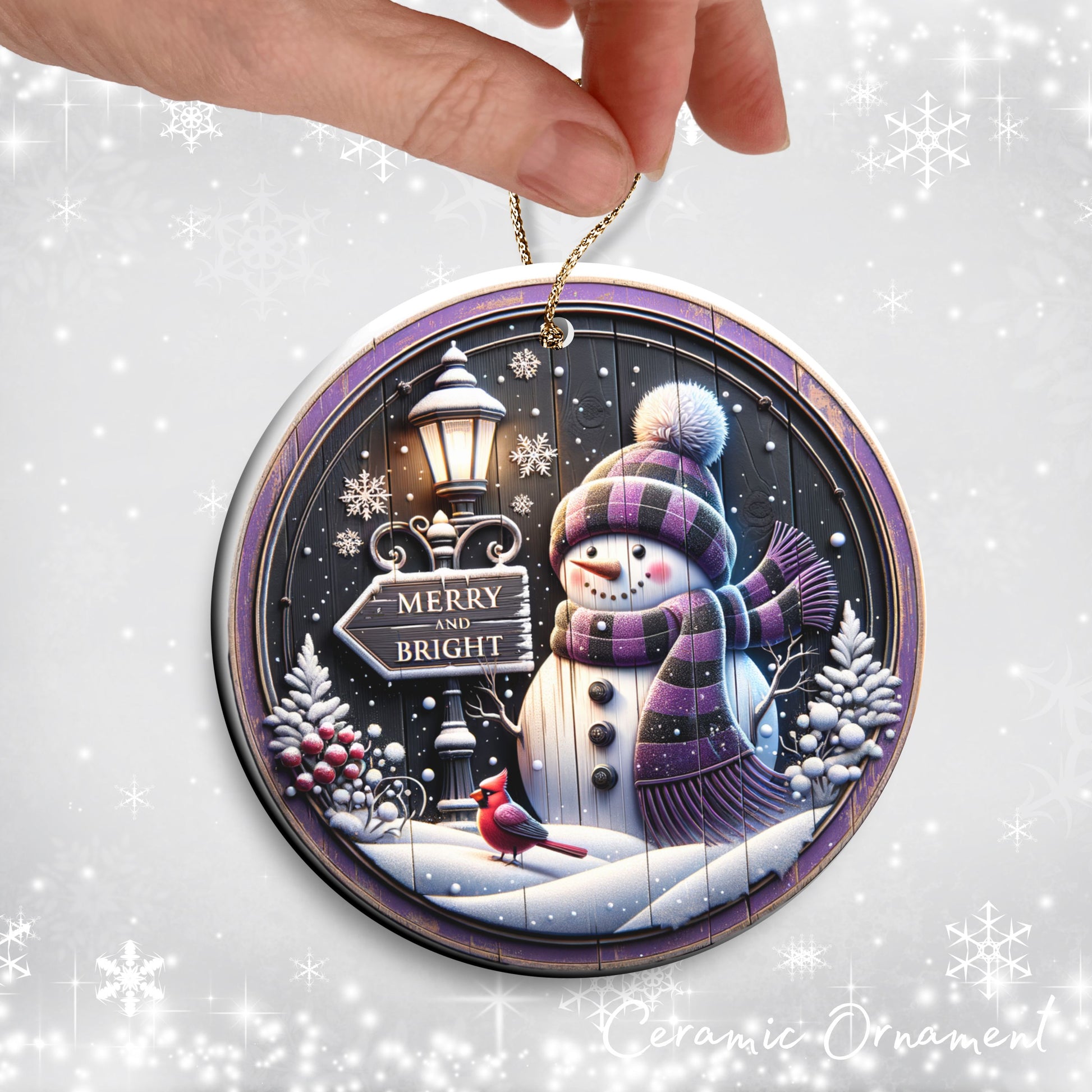 Rustic Merry and Bright Purple Snowman Ceramic Ornament 102-02