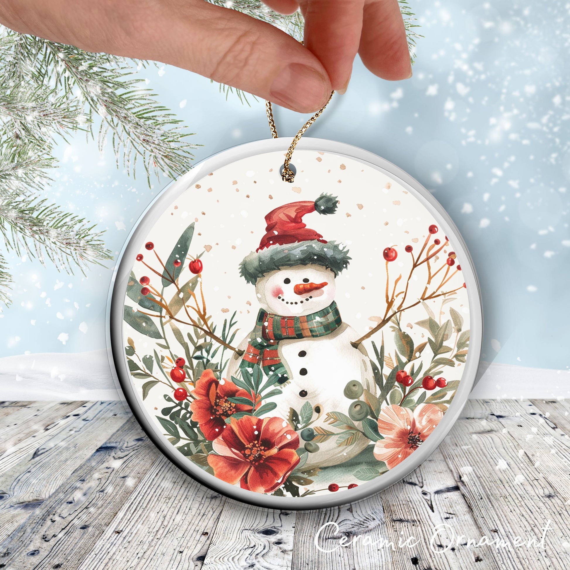 Retro Snowman Watercolor Ceramic Ornament 151-18