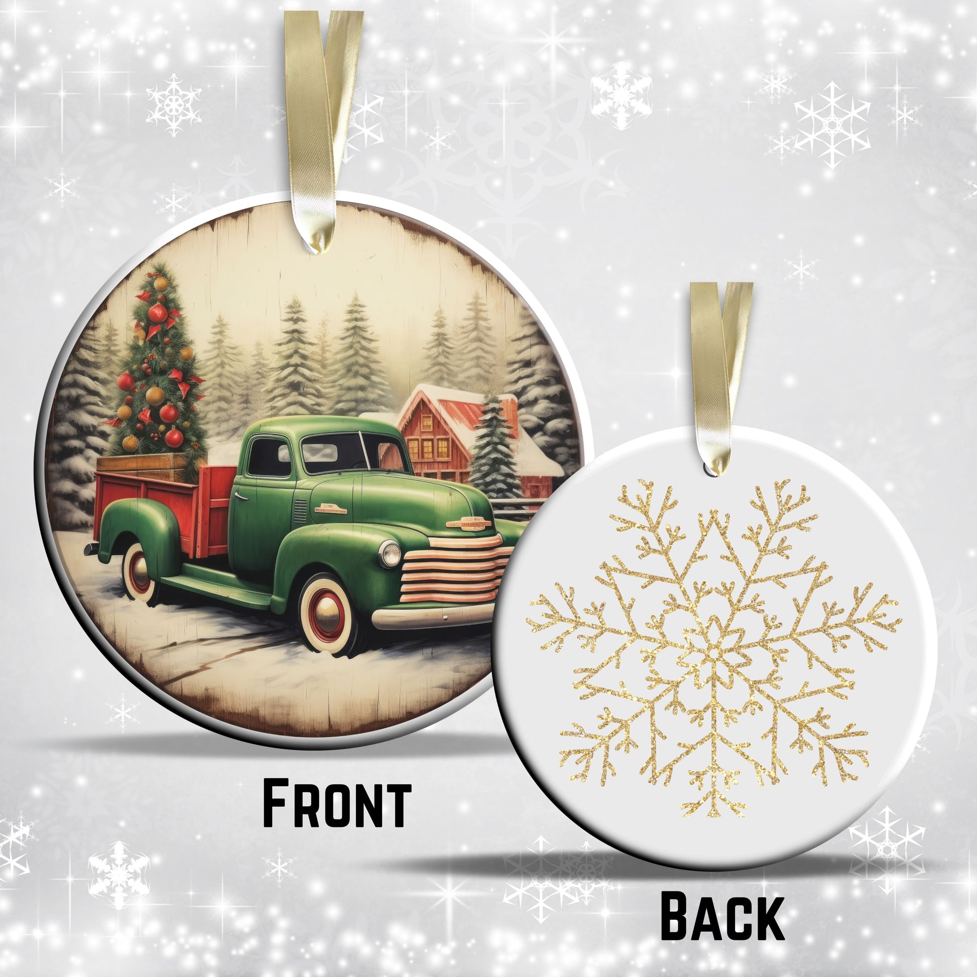 Beautiful Vintage Farm Red Truck Designs, printed on a ceramic round ornament as an image. These lovely ornaments will come with a string for hanging. Note: string color will be determined by the ornament.