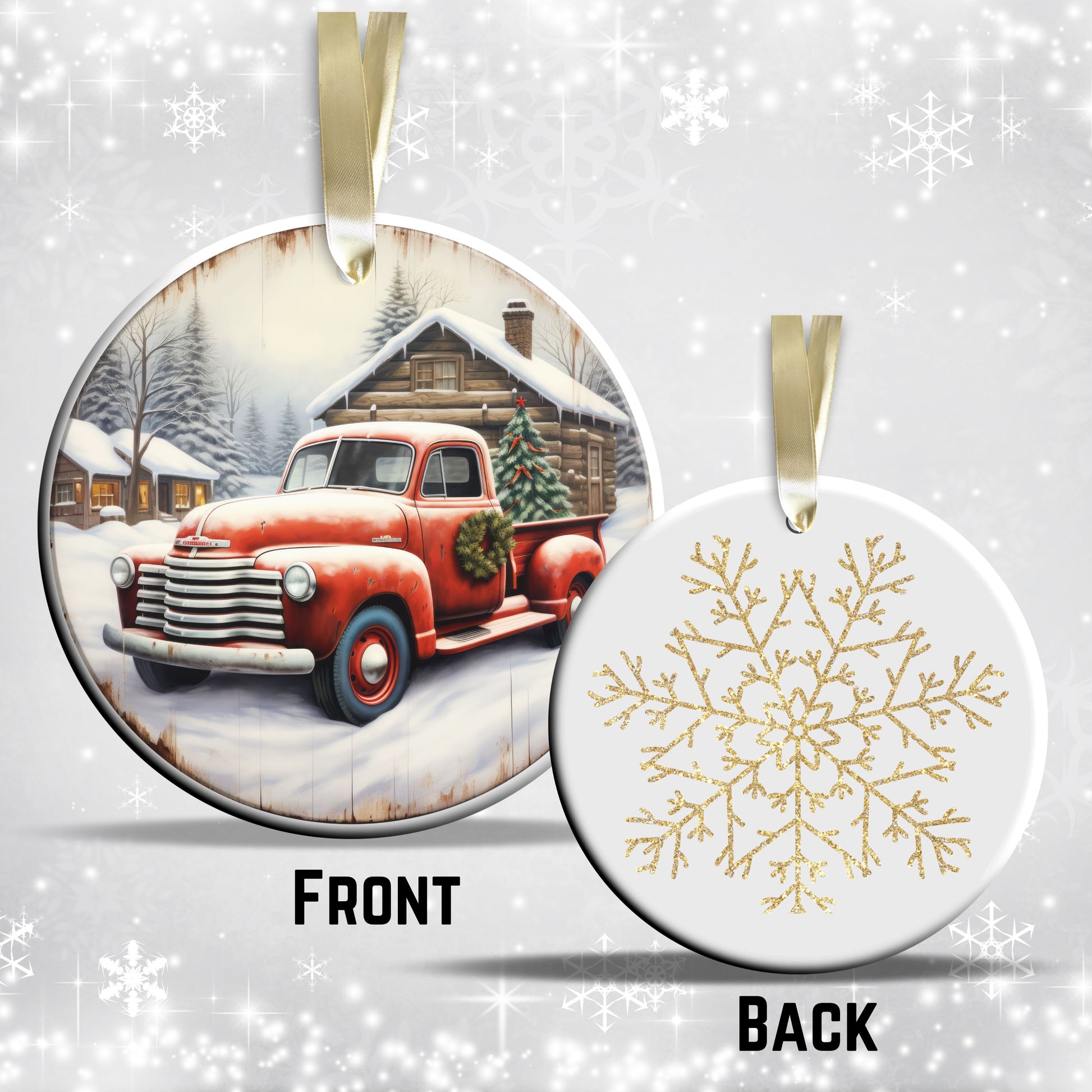 Beautiful Vintage Farm Red Truck Designs, printed on a ceramic round ornament as an image. These lovely ornaments will come with a string for hanging. Note: string color will be determined by the ornament.