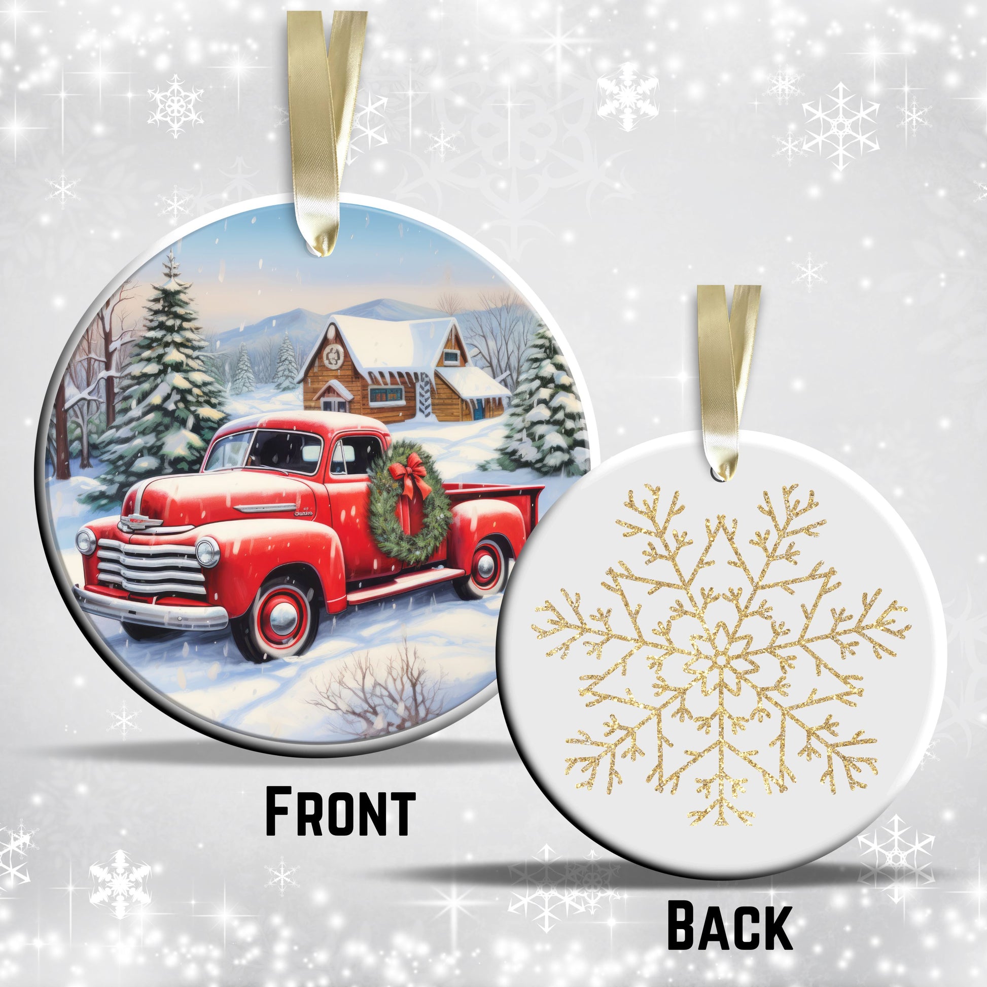 Beautiful Vintage Farm Red Truck Designs, printed on a ceramic round ornament as an image. These lovely ornaments will come with a string for hanging. Note: string color will be determined by the ornament.